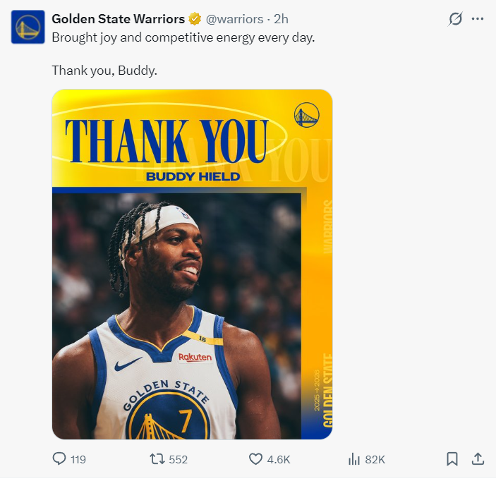 勇士官方也感谢了希尔德、库明加,这两被送到老鹰。